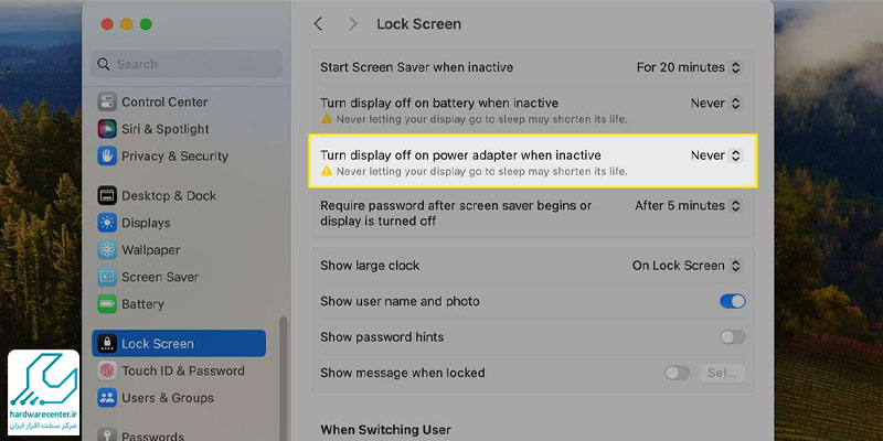 آیتم دیگر برای جلوگیری از خاموش شدن خودکار صفحه مک Turn display off on power adapter when inactive است. این گزینه برای تعیین زمان خواب سیستم در مواقعی که مک بوک به آداپتور شارژر متصل شده باشد، به کار می رود. با کلیک روی این عبارت مشخص می کنید که چه مدت پس از کار نکردن با دستگاه صفحه نمایش کامپیوتر خاموش شود.